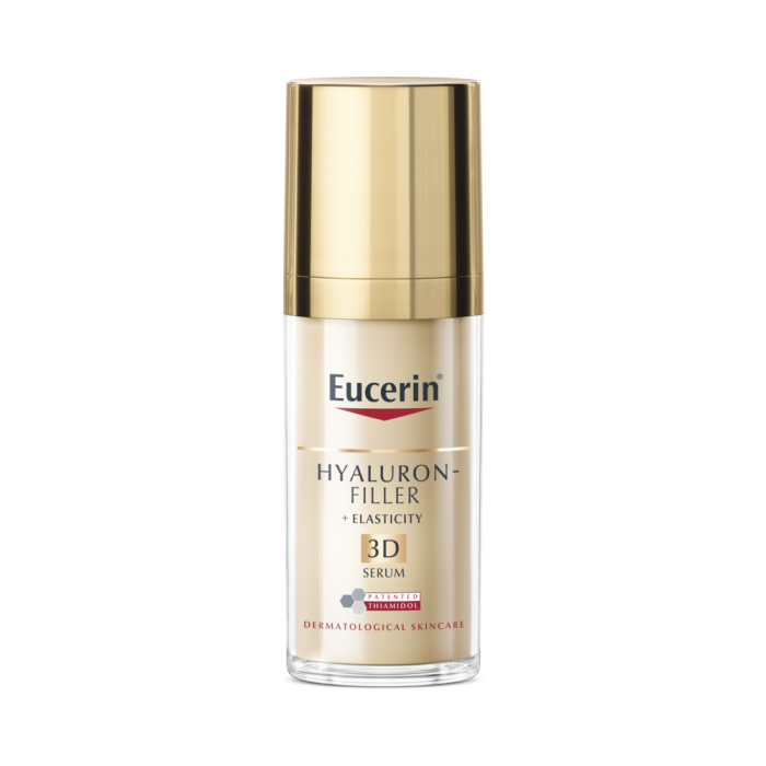 Eucerinin Hyaluron-Filler + Elasticity 3D Serum on kevyt ja kosteuttava ikääntymisen merkkejä ehkäisevä hoitoseerumi, joka on kehitetty dermatologisten hoitojen inspiroimana. Se hoitaa tehokkaasti kaikkia kolmea ihon ikääntymisen merkkiä: