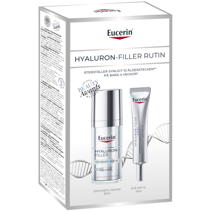 Eucerin Hyaluron-Filler Epigenetic Serum & Eye Cream -lahjapakkaus sisältää kaksi tehokasta anti-age -tuotetta: Hyaluron-Filler Epigenetic Seerumin 30ml ja Hyaluron-Filler Eye Cream SPF 15 -silmänympärysvoiteen 15ml.