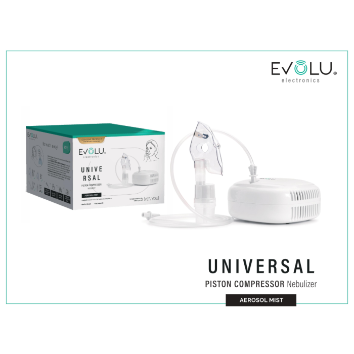 EVOLU Universal nebulisaattori mäntäkompressorilla on tarkoitettu sumutinsuspensioiden ja sumutinliuosten nebulisointiin kotikäytössä ja hoivayksiköissä. Voidaan käyttää myös apteekista saatavan isotonisen suolaliuoksen inhaloimiseen hengitystieinfektioiden yhteydessä. Sopii kaikenikäisille. Helppokäyttöinen. EVOLU Universal nebulisaattori muodostaa nebulisoitavasta lääkkeestä hyvin hienojakoista lääkesumua (hiukkaskoko 0,5 – 6 mikronia, MMAD 2,44 mikronia), jonka potilas inhaloi keuhkoihinsa.