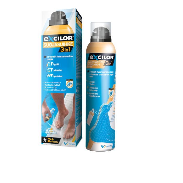 Excilor 3in1 suojasuihke tekee 8 tunnin huomaamattoman suojan erilaisia jalkainfektioita vastaan, kuten syylät, jalkasieni ja kynsisieni.