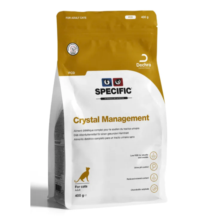 Specific Crystal Management FCD on eläinlääkärien suosittelema dieettiruoka kissoille, jotka kärsivät virtsatieongelmista tai ovat alttiita struviittikivien muodostumiselle. Alhainen magnesium- ja fosforipitoisuus sekä virtsan pH:ta alle 6,4 pitävä koostumus ehkäisevät tehokkaasti kiteiden uusiutumista. Omega-3-rasvahapot (EPA ja DHA) tukevat lisäksi ihon, turkin ja nivelten terveyttä. Sopii kissoille, joilla on todettu FLUTD, idiopaattinen kystiitti tai virtsaputken tukkeuma.