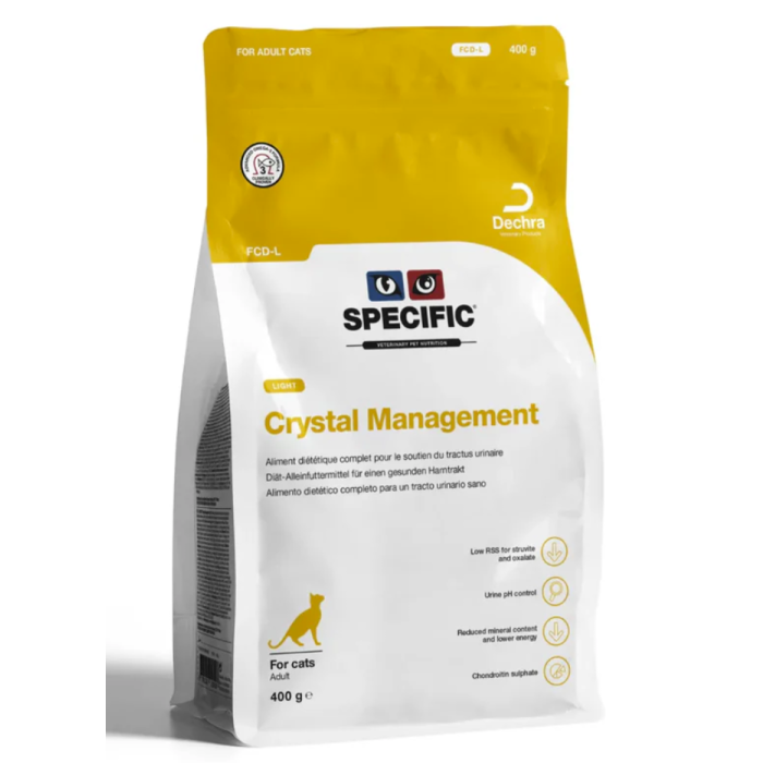 SPECIFIC Crystal Management Light FCD-L on erikoisdieettiruoka, joka yhdistää kaksi tärkeää ominaisuutta: virtsateiden terveyden tukemisen ja painonhallinnan. Se on suunniteltu erityisesti ylipainoisille kissoille tai kissoille, joilla on taipumus lihoa, mutta jotka tarvitsevat samalla suojaa struviittikivien uusiutumista vastaan.