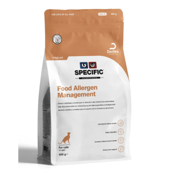 SPECIFIC Food Allergen Management FDD-HY on täysipainoinen erikoisdieettiruoka, joka on kehitetty lievittämään ruoka-aineallergioiden ja -intoleranssien oireita sekä tukemaan kissan ruoansulatusjärjestelmää. Se sopii sekä kissanpennuille että aikuisille kissoille ja soveltuu käytettäväksi myös ruoka-ainekokeiluissa sekä tulehduksellisten suolistosairauksien (IBD) hoidon tukena.