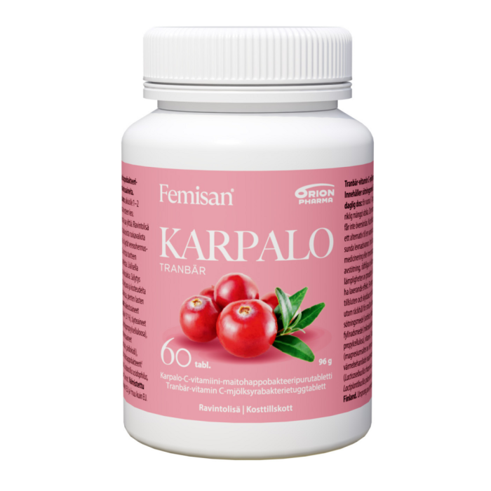 Ainesosat Ainesosat: makeutusaineet (sorbitoli, ksylitoli), karpalojauhe2 (31 %), täyteaineet (mikrokiteinen selluloosa, hydroksipropyyliselluloosa), C-vitamiini2, paakkuuntumisenestoaineet (rasvahappojen magnesiumsuolat, piidioksidi), lämpökäsitellyt inaktivoidut maitohappobakteerit1 (Lacticaseibacillus rhamnosus, Lactobacillus acidophilus, Lactiplantibacillus plantarum), aromit.