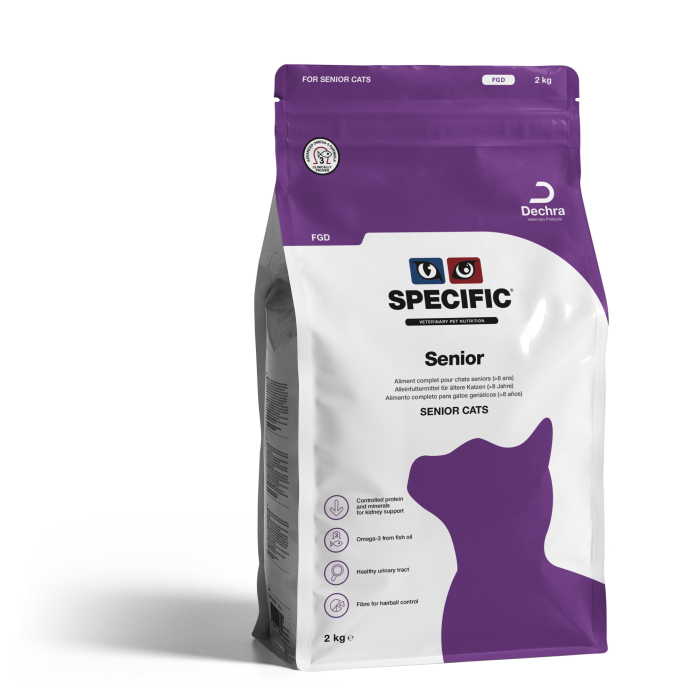 SPECIFIC Senior FGD on täysravinto, joka on kehitetty vastaamaan ikääntyvien, yli 8-vuotiaiden kissojen erityistarpeita. Tasapainoinen ravintokokonaisuus tukee useita ikääntymisen myötä haasteutuvia osa-alueita – munuaisista niveliin ja virtsateistä turkin kuntoon.