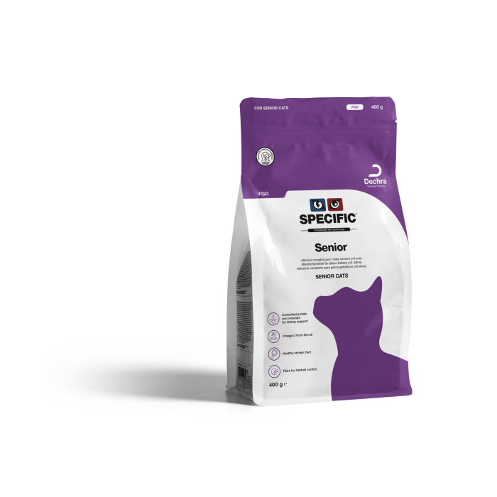 SPECIFIC Senior FGD on erityisesti yli 8-vuotiaille kissoille suunniteltu täysravinto, joka vastaa ikääntyvän kissan muuttuviin ravitsemustarpeisiin. Kohtuullisesti vähennetty proteiini- ja fosforipitoisuus tukee munuaisten toimintaa, kun taas runsas EPA- ja DHA-rasvahappojen pitoisuus edistää nivelten liikkuvuutta, ihon terveyttä ja kiiltävää turkkia. Korkea kuitupitoisuus hallitsee karvapallojen muodostumista ja yucca-uute vähentää ulosteen epämiellyttäviä hajuja.
