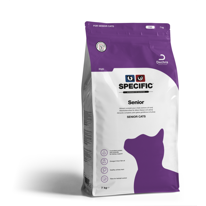 SPECIFIC Senior FGD on erityisesti yli 8-vuotiaille kissoille suunniteltu täysravinto, joka vastaa ikääntyvän kissan muuttuviin ravitsemustarpeisiin. Kohtuullisesti vähennetty proteiini- ja fosforipitoisuus tukee munuaisten toimintaa, kun taas runsas EPA- ja DHA-rasvahappojen pitoisuus edistää nivelten liikkuvuutta, ihon terveyttä ja kiiltävää turkkia. Korkea kuitupitoisuus hallitsee karvapallojen muodostumista ja yucca-uute vähentää ulosteen epämiellyttäviä hajuja.