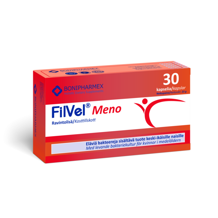 FilVel® Meno on vaihdevuosi-ikäisille tarkoitettu ravintolisä. Jokainen kapseli sisältää yli 8 miljardia maitohappobakteeria, jotka edustavat 4 kantaa ja 2 lajia. Ravintolisä on tarkoitettu intiimialueen hyvinvointiin. Suositellaan käytettäväksi yhdessä FilVel® Harmonyn kanssa parhaan vaikutuksen saavuttamiseksi. Ota yksi kapseli päivittäin, mieluiten aamulla yhdessä lasillisen veden kanssa.