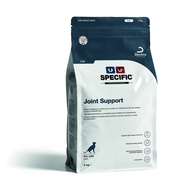SPECIFIC Joint Support FJD on täysravinto aikuisille ja ikääntyville kissoille, jotka kärsivät nivelrikosta tai tarvitsevat tukea nivelten hyvinvointiin. Korkeat EPA- ja DHA-rasvahappojen pitoisuudet sekä glukosamiini ja kondroitiini tukevat nivelten liikkuvuutta ja rustojen terveyttä. Kohtuullinen energiapitoisuus ja L-karnitiini auttavat ylläpitämään ihannepainoa ja lihasmassaa, mikä vähentää niveliin kohdistuvaa kuormitusta.