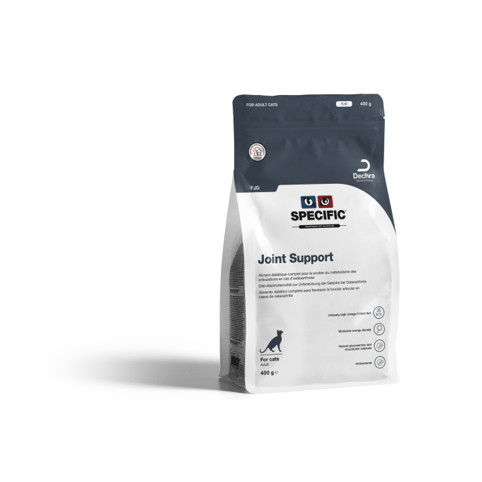 SPECIFIC Joint Support FJD on täysravinto aikuisille ja ikääntyville kissoille, jotka kärsivät nivelrikosta tai tarvitsevat tukea nivelten hyvinvointiin. Korkeat EPA- ja DHA-rasvahappojen pitoisuudet sekä glukosamiini ja kondroitiini tukevat nivelten liikkuvuutta ja rustojen terveyttä. Kohtuullinen energiapitoisuus ja L-karnitiini auttavat ylläpitämään ihannepainoa ja lihasmassaa, mikä vähentää niveliin kohdistuvaa kuormitusta.