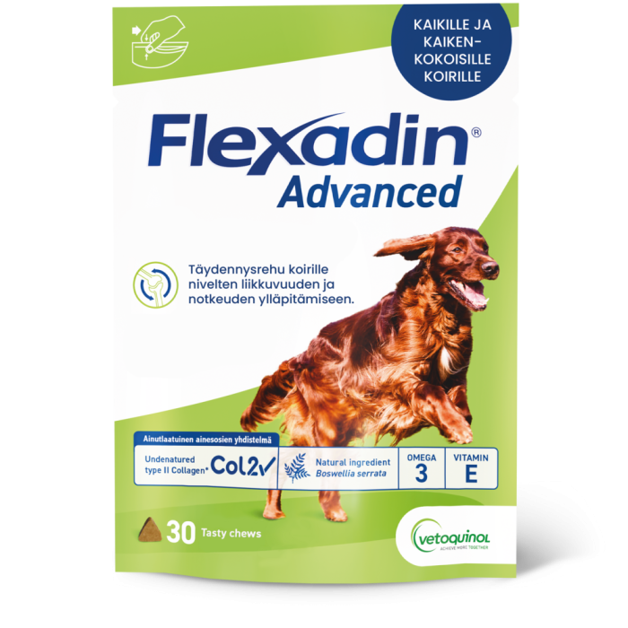 Ainutlaatuinen tuote, joka tukee koiran nivelten normaalia liikkuvuutta. Helposti kerran päivässä annosteltava hyvänmakuinen purutabletti. Sisältää UC-II® ja Boswellia serrata.