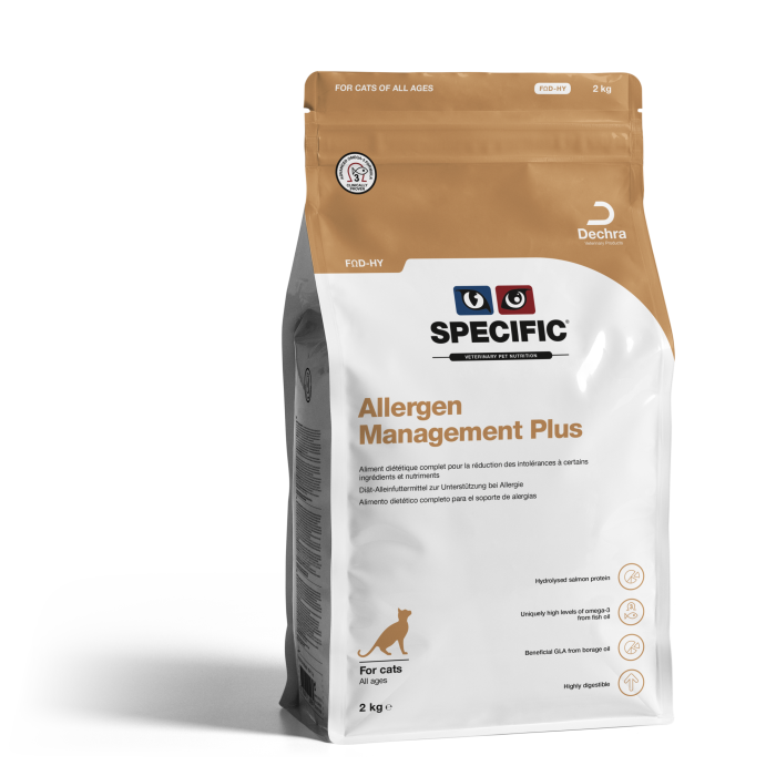 SPECIFIC Allergen Management Plus FOD-HY on erikoisdieettiruoka, joka on kehitetty hallitsemaan allergisia iho- ja ruoansulatusongelmia kokonaisvaltaisesti. Se sopii sekä kissanpennuille että aikuisille kissoille ja täyttää molempien ravitsemukselliset tarpeet täysipainoisena ruokana.