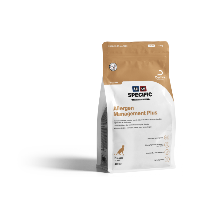 SPECIFIC Allergen Management Plus FOD-HY on erikoisdieettiruoka, joka on kehitetty hallitsemaan allergisia iho- ja ruoansulatusongelmia kokonaisvaltaisesti. Se sopii sekä kissanpennuille että aikuisille kissoille ja täyttää molempien ravitsemukselliset tarpeet täysipainoisena ruokana.