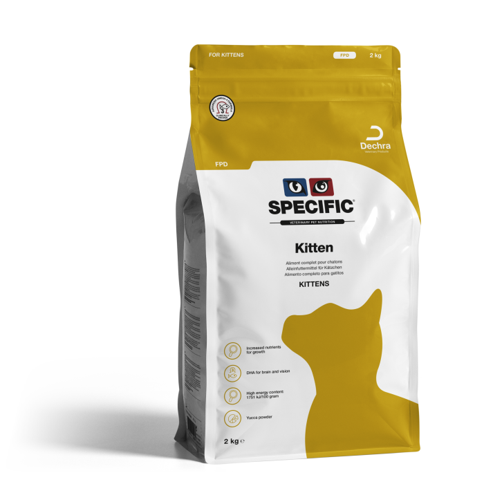 SPECIFIC Kitten FPD on ravitseva täysravinto, joka on suunniteltu kasvavien kissanpentujen sekä tiineiden ja imettävien emojen erityistarpeisiin. Runsaat proteiini-, vitamiini- ja kivennäisainepitoisuudet tukevat tervettä kasvua ja kehitystä, ja DHA edistää aivojen sekä näkökyvyn normaalia kehittymistä. Korkealaatuiset ja helposti sulavat ainesosat takaavat ravinteiden optimaalisen imeytymisen, ja yucca-uute pitää ulosteen hajun kurissa.