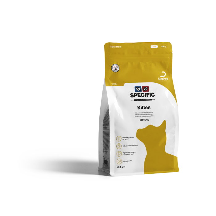 SPECIFIC Kitten FPD on ravitseva täysravinto, joka on suunniteltu kasvavien kissanpentujen sekä tiineiden ja imettävien emojen erityistarpeisiin. Runsaat proteiini-, vitamiini- ja kivennäisainepitoisuudet tukevat tervettä kasvua ja kehitystä, ja DHA edistää aivojen sekä näkökyvyn normaalia kehittymistä. Korkealaatuiset ja helposti sulavat ainesosat takaavat ravinteiden optimaalisen imeytymisen, ja yucca-uute pitää ulosteen hajun kurissa.