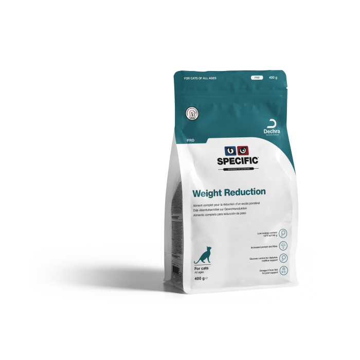 SPECIFIC Weight Reduction FRD on täysravinto, joka on kehitetty tukemaan ylipainoisten kissojen painonpudotusta ja painonhallintaa sekä auttamaan glukoositasapainon säätelyssä diabetesta sairastavilla kissoilla. Monipuolinen ravintokokonaisuus huolehtii siitä, että kissa laihtuu terveellisesti ilman nälän tunnetta tai lihasmassan menetystä.