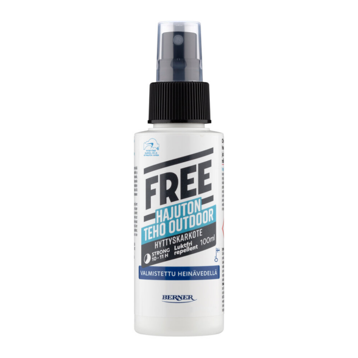Hyttysten, punkkien, paarmojen, mäkäräisten ja polttiaisten karkottamiseen iholta. Free Outdoor on hajuton tehotuote, joka sopii vaativiinkin olosuhteisiin. Tuote antaa pitkäaikaisen tehon jopa 10–11 tunnin ajaksi hyttysiä ja punkkeja vastaan. Tuote valmistetaan Suomessa, Heinävedellä ja sillä on Avainlippu-tunnus. Tehoaine: ikaridiini 20,6% Pakkauskoko: 100ml Noudata käyttöohjeita.