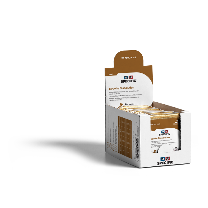 SPECIFIC Struvite Dissolution FSW on erikoisdieettiruoka aikuisille kissoille, joka on suunniteltu liuottamaan olemassa olevia struviittikiviä ja ehkäisemään uusien muodostumista. Vähennetty magnesium- ja fosforipitoisuus sekä virtsan pH-arvo välillä 6,0–6,3 tukevat tehokkaasti struviittikiteiden liukenemista, ja lisääntynyt natriumpitoisuus kannustaa kissaa juomaan enemmän virtsan laimentamiseksi. Omega-3-rasvahapot (EPA ja DHA) tukevat lisäksi ihon, turkin ja nivelten hyvinvointia.
