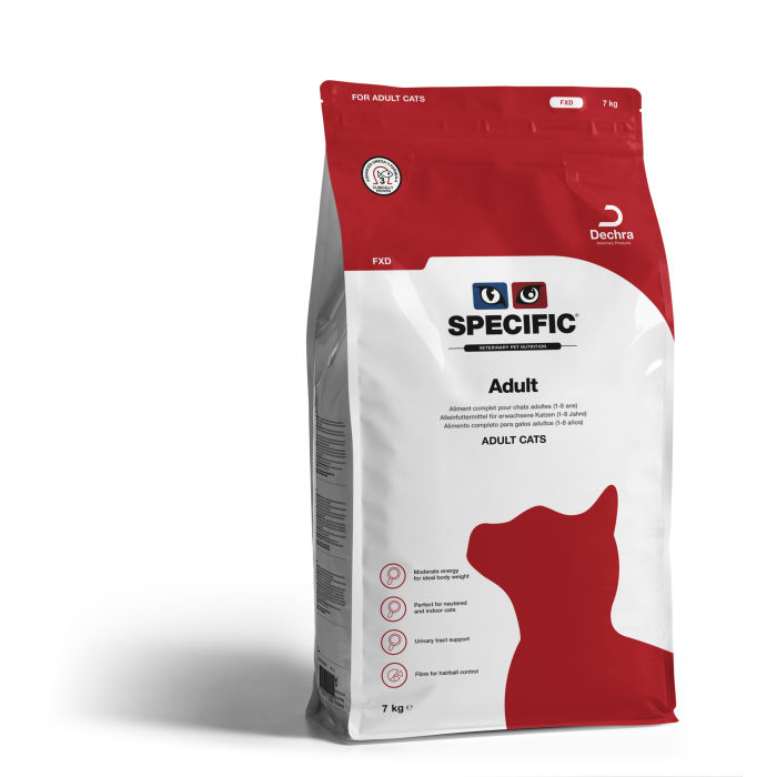 SPECIFIC Adult FXD on tasapainoinen täysravinto, joka on kehitetty alle 8-vuotiaiden terveiden aikuisten kissojen päivittäiseen ravitsemukseen. Se sopii myös painonhallintaan laihdutusjakson jälkeen sekä virtsateiden terveyden pitkäjänteiseen tukemiseen.