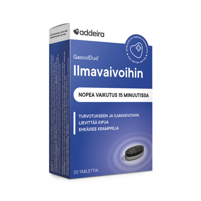 GascolDuo on kaksivaikutteinen lääkinnällinen laite, jota käytetään turvotukseen ja ilmavaivoihin lievittämään kouristuksia ja kipuja.