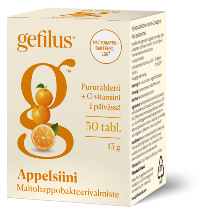 Maailman tutkituinta Lactobacillus Rhamnosus (LGG®) -maitohappobakteeria sisältävä appelsiinin makuinen maitohappobakteeripurutabletti, mukana myös vastustuskyvyn normaalia toimintaa edistävää C-vitamiinia.
