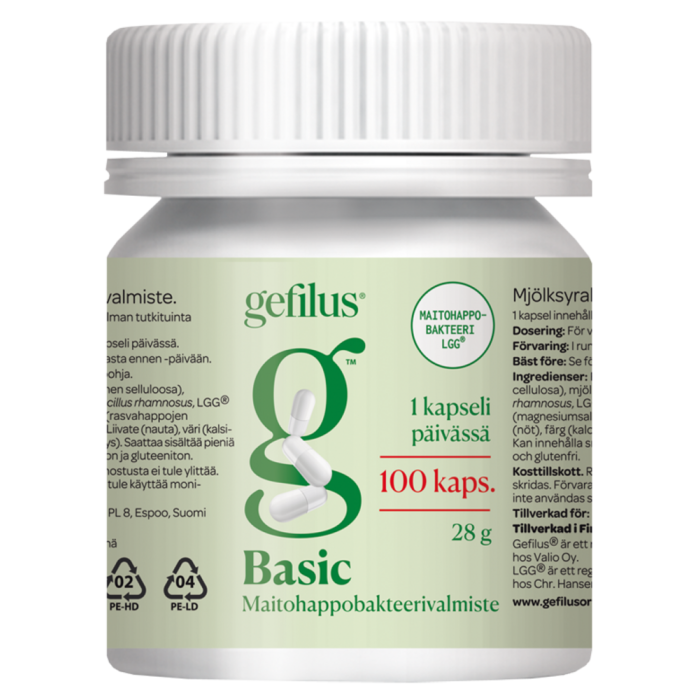 Gefilus Basic kapselit sisältävät maailman tutkituinta Lactobacillus rhamnosus GG maitohappobakteeria. Ravintolisä. Gefilus-kapselit ovat gluteenittomia ja laktoosittomia. Sopii koko perheelle päivittäiseen käyttöön.
