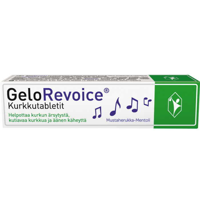 GeloRevoice® kurkkutabletit suojaavat tehokkaasti suun ja nielun limakalvoja ja helpottavat esimerkiksi kurkun ärsytystä, kutiavaa kurkkua ja äänen käheyttä. Niitä käytetään lievittämään mm. äänen käheyttä, kurkun ärsytystä, kutiavaa kurkkua ja limakalvojen kuivumista.