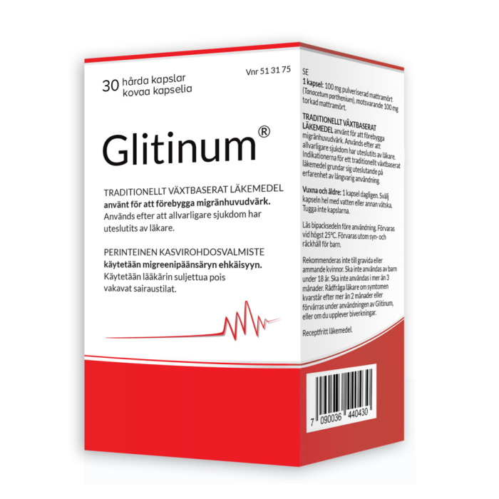 Glitinum on perinteinen kasvirohdosvalmiste migreenipäänsäryn ennaltaehkäisyyn. Älä käytä valmistetta mikäli olet yliherkkä valmisteen sisältämälle aineelle. Jos oireet pahenevat valmisteen käytön aikana on otettava yhteyttä lääkäriin tai muuhun terveydenhuollon ammattilaiseen. Haittavaikutukset: mahdolliset ruoansulatushäiriöt