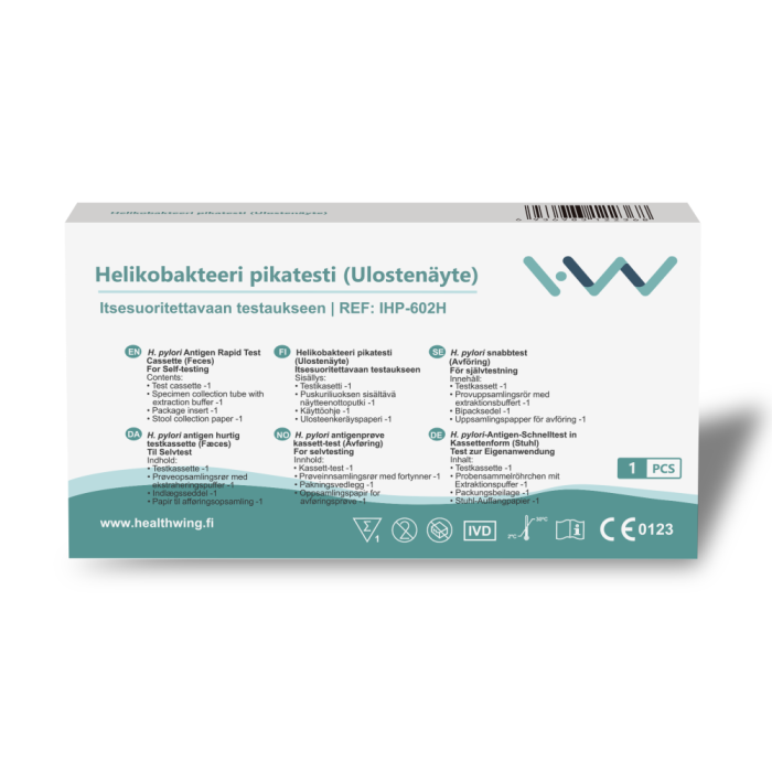 Luotettava testi Helikobakteeri (H. pylori) -antigeenin määrittämiseen ulostenäytteestä. Tee testi jos sinulla on toistuvia vatsan tai suoliston ongelmia. Itsesuoritettavaan testauksen ja in vitro -diagnostiseen käyttöön CE-merkitty (0123) Kokonaistarkkuus: 97,8%