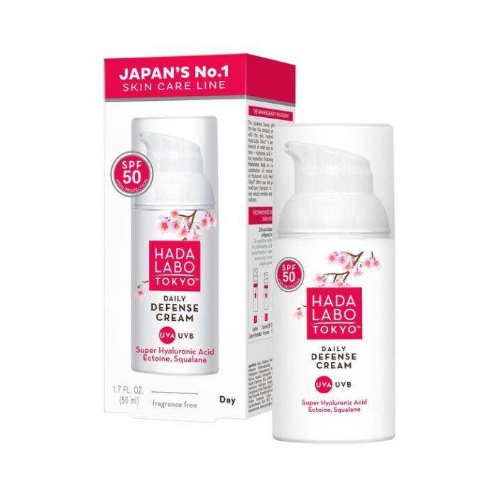 HADA LABO TOKYO Lightweight Protective Cream SPF 50 on monivaikutteinen kosteusvoide, joka yhdistää korkean aurinkosuojan ja syväkosteuttavan sekä ihoa rauhoittavan vaikutuksen. Silkkinen koostumus sisältää superhyaluronihappoa, kollageenia ja allantoiinia, jotka yhdessä kosteuttavat tehokkaasti, auttavat lievittämään ärsytystä ja vahvistamaan ihon suojakerrosta.