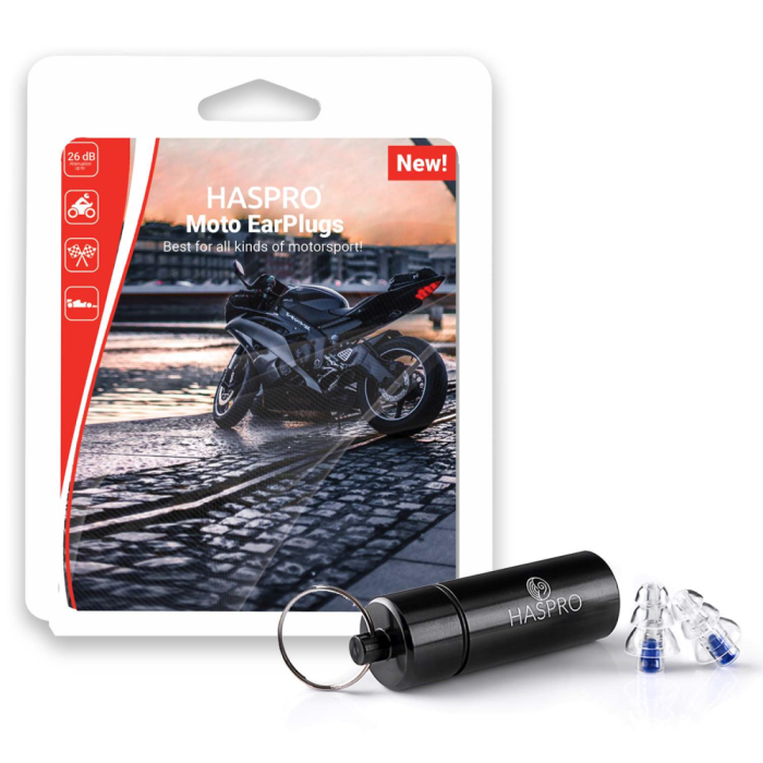 Haspro Moto Earplugs – Suunniteltu suojaamaan kuuloa moottoripyörällä ajettaessa. Kevyet ja äänettömät korvatulpat käyttää. Vähentävät tuulen aiheuttamaa melua, mutta antavat moottoriäänten ja liikenteen signaalien kuulua. Äänenvaimennus SNR: 26 dB.