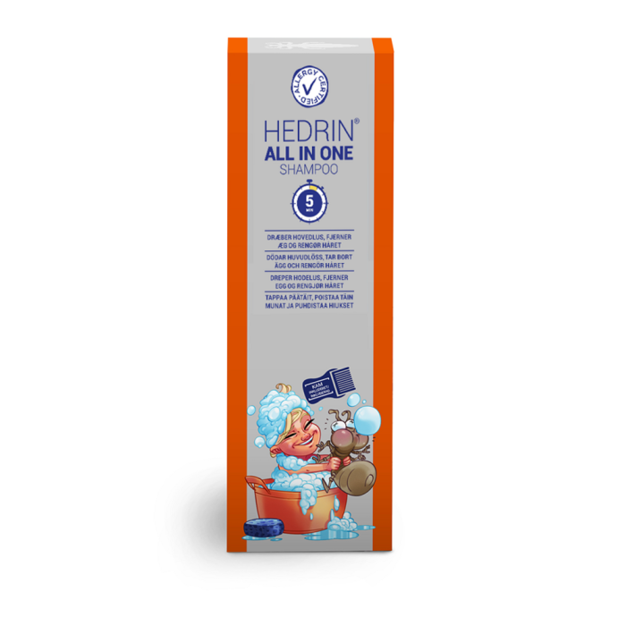 Nopeimmin eroon täistä ja niiden munista – helposti hiustenpesun yhteydessä! Vaikutusaika vain 5 minuuttia. Hedrin All in One Shampoolla pääset eroon täistä ja niiden munista yhdellä hiusten pesulla. Hedrin All in One Shampoo tappaa täit, poistaa munat ja puhdistaa hiukset. Hedrin All in One Shampoon vaikutus perustuu fysikaaliseen vaikutusmekanismiin. Siksi täit eivät pysty kehittämään vastustuskykyä Hedrin All in One Shampoolle. Hedrin All in One Shampoo tappaa kaikki elävät täit ja liuottaa samalla liima-aineen, joka kiinnittää täiden munat hiuksiin. Täiden munat irtoavat ja huuhtoutuvat näin helposti pois samalla kun hiukset pestään ja huuhdellaan. Allergy Certified -merkitty. Hajusteeton.