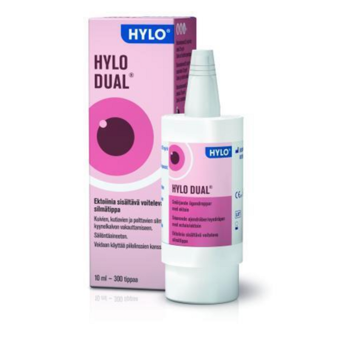 Hylo Dual on säilöntäaineeton natriumhyaluronihappoa sisältävä silmätippa allergisille, kuiville ja ärtyneille silmille Lievittää tulehduksellisia ja allergisia oireita, kuten silmien kutinaa ja silmien polttelua sekä tasapainottaa kyynelkalvoja Suojaa silmiä kyynelten liialliselta haihtumiselta Tämä kyynelkalvon stabilointi lievittää ärtyneiden silmien tulehdusoireita Voitelee silmiä pitkään sekä sopii pitkäaikaiseen käyttöön Sopii myös ärtyneiden silmien kostuttamiseen Sopii aikuisille ja yli 6-vuotiaille lapsille Säilyy 6 kuukautta avattuna Säilöntäaineeton ja fosfaatiton steriili silmätippa CE 0197 -merkitty lääkinnällinen laite