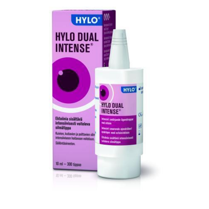 HYLO Dual Intense® hyaluronihappo 2,0 mg/ml + ektoiini 20 mg/ml Kroonisesti kuiville silmille. Voidaan käyttää silmäkirurgisten toimenpiteiden jälkeen. Pitkäaikaisvaikutteinen lievitys tulehduksellisiin oireisiin. Korkealaatuista hyaluronihappoa 2 mg/ml (0,2%) + Ektoiinia 20 mg/ml Ei voi käyttää piilolinssien kanssa. HYLO EYE CARE tuotteita voidaan käyttää, jos lasiaiskalvo on irti Säilyy avattuna 6 kk. Ei sisällä lisäaineita.
