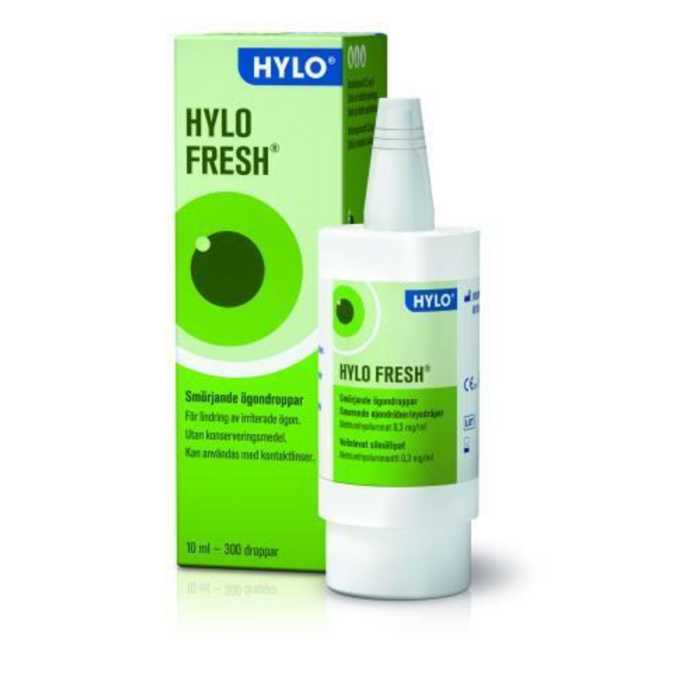 HYLO®-Fresh hyaluronihappo 0,3 mg/ml Voitelevat silmätipat. Lieviin, lyhytaikaisiin oireisiin. Sisältää korkealaatuista hyaluronihappoa 0,3 mg/ml. Sisältää silmäruohoa (Euphrasia officinalis)– vähentää punasilmäisyyttä. Voidaan käyttää piilolinssien kanssa. HYLO EYE CARE tuotteita voidaan käyttää, jos lasiaiskalvo on irti Säilyy avattuna 6 kk. Ei sisällä lisäaineita