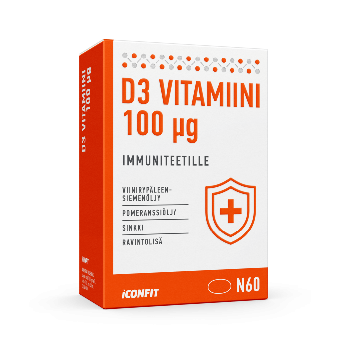 Iconfit Vitamin D3 vastustuskyvylle sisältää korkean annoksen D-vitamiinia (4000 IU). Lisäksi se sisältää rypäleensiemenöljyä, karvasappelsiiniöljyä ja Sinkkiä. D-vitamiini on yksi tärkeimmistä vitamiineista ja vaikuttaa useimpien elimistön elinten normaaliin toimintaan. ANNOSTUS: Aikuisille 1 kapseli päivässä vesilasillisen kera. Ravintolisä ei korvaa monipuolista ja tasapainoista ruokavaliota eikä terveitä elämäntapoja. Päivittäistä annossuositusta ei tule ylittää. Säilytettävä lasten ulottumattomissa. Ei suositella käytettäväksi raskauden ja imetyksen aikana. SÄILYTYS: säilytä alkuperäispakkauksessa huoneenlämmössä 5–25 °C, kosteudelta ja suoralta auringonvalolta suojattuna. 60 öljykapselia, nettopaino 30,3 g. Iconfit.FI