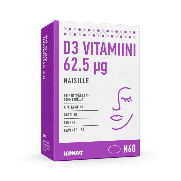 Iconfit Vitamin D3 naisille sisältää kohtuullisen annoksen D-vitamiinia (2500 IU). Lisäksi se sisältää biotiinia, Sinkkiä, A-vitamiinia ja rypäleensiemenöljyä. D-vitamiini on yksi tärkeimmistä vitamiineista ja vaikuttaa useimpien elimistön elinten normaaliin toimintaan. Valmistettu käyttäen ainoastaan korkealaatuisia öljykapseleita. Aikuisille 1 kapseli päivässä vesilasillisen kera. Ravintolisä ei korvaa monipuolista ja tasapainoista ruokavaliota eikä terveitä elämäntapoja. Päivittäistä annossuositusta ei tule ylittää. Säilytettävä lasten ulottumattomissa. SÄILYTYS: säilytä alkuperäispakkauksessa huoneenlämmössä 5–25 °C, kosteudelta ja suoralta auringonvalolta suojattuna. 60 öljykapselia, nettopaino 30,3 g