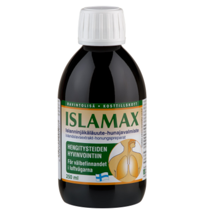 Hyvänmakuinen ja luonnollinen Islamax sisältää islanninjäkälästä, peltokortteesta, timjamista ja aniksen siemenistä valmistettuja uutteita. Niitä on perinteisesti käytetty limaa irrottavien ominaisuuksiensa vuoksi ja tukemaan hengitysteiden ja keuhkojen limakalvojen hyvinvointia.