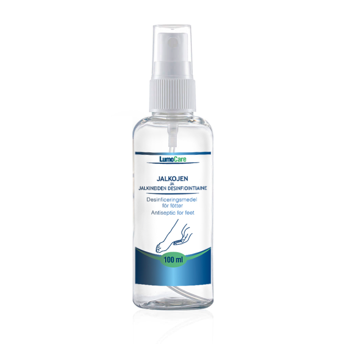 Lumocare jalkojen ja jalkineiden desinfiointiaine on etanoli pohjainen antiseptinen tuote joka ennaltaehkäisee mikro-organismien ja jalkojen sieni-infektioiden kasvua samalla eliminoiden sienisairauksille sopivan elinympäristön kynsiltä ja iholta. Valmistetta voidaan käyttää alkoholia kestävien jalkineiden desinfiointiin. Vähentää tehokkaasti jalkojen hikoilua ja estää siten epämiellyttävien hajujen ilmaantumisen. Tuote virkistää ja elvyttää jalkoja ja sisältää glyseriiniä suojaamaan ihoa. Biosidi. Käytä biosideja turvallisesti. Lue aina merkinnät ja valmistetiedot ennen käyttöä.