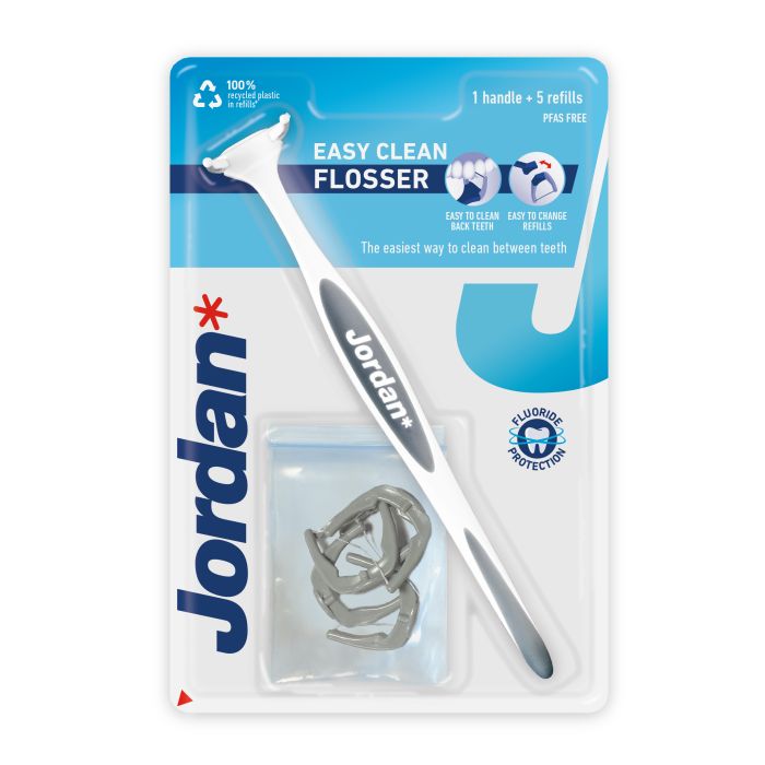 Jordan Easy Clean Flosser on helppokäyttöinen hammaslankain. Vaihdettavia, fluoria sisältäviä lankainosia on 1+5 kpl. Ergonomisesti muotoiltu varsiosa helpottaa takana olevien hammasvälien puhdistamista.