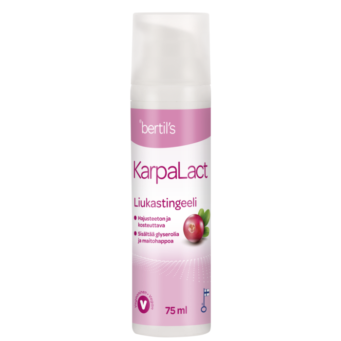 KarpaLact Liukastingeeli on hajusteeton ja kosteuttava liukaste, joka sopii päivittäiseen käyttöön sekä herkille intiimialueen limakalvoille. Geeli sisältää maitohappoa, joka ylläpitää luonnollista pH-tasapainoa, kosteuttavaa glyseriiniä ja raikastavaa karpalouutetta. Silikoniton koostumus tekee tuotteesta turvallisen käytettäväksi yhdessä kondomin kanssa. Kehitetty ja valmistettu Suomessa, ja se on täysin vegaaninen.