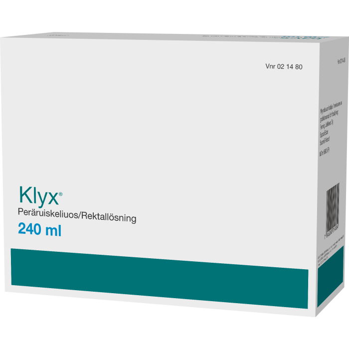 Klyx sisältää dokusaattinatriumia ja sorbitolia ja sitä käytetään tilapäisen ummetuksen hoitoon ja suolen tyhjentämiseen ennen tähystystä, lantioseudun röntgentutkimusta sekä synnytystä. Klyx pehmentää ulostetta lisäämällä sen vesipitoisuutta. Kova uloste pehmenee ja edesauttaa suolen tyhjentymistä häiritsemättä suolen normaalia refleksitoimintaa. Lapsille ja pitkäaikaiseen käyttöön vain lääkärin ohjeen mukaan.