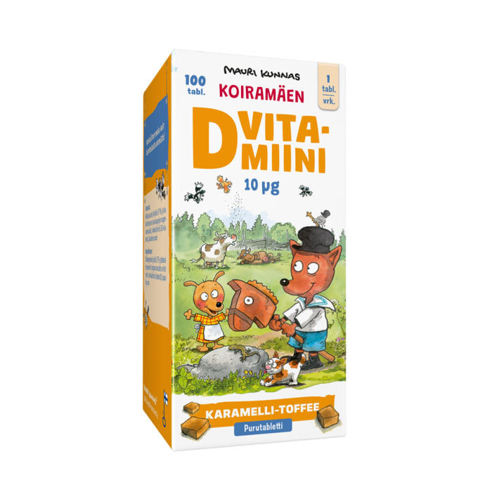 Koiramäen D-vitamiini 10 µg on uusi kotimainen lapsille suunniteltu D-vitamiinivalmiste lasten luuston kasvuun ja kehitykseen sekä vastuskyvyn tukemiseen. Suussa sulavan karamelli-toffeen makuinen purutabletti, joka on makeutettu ainoastaan hammasystävällisellä ksylitolilla. Maku luontaisesta aromista. Laktoositon, gluteeniton, sokeriton, väriaineeton, liivatteeton, maidoton.