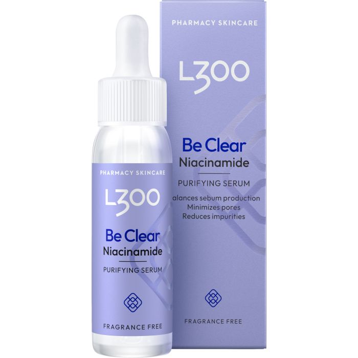 L300 Niacinamide Be Clear Purifying Serum on monivaikutteinen seerumi. Sisältää niasiiniamidia, joka säätelee tehokkaasti ihon talin tuotantoa sekä minimoi epäpuhtauksia ja vähentää ihohuokosten näkyvyyttä. Seerumi ylläpitää ihon kosteustasapainoa hyaluronihapon ja glyseriinin avulla. Sisältää myös ihoa rauhoittavaa cicaa (Centella Asiatica). Tuloksena on kirkkaampi ja tasapainoisempi iho, jossa on vähemmän epäpuhtauksia. Dermatologisesti testattu. Hajusteeton. Kehitetty erityisesti rasvoittuvalle/sekaiholle ja testattu myös herkällä iholla. Käytä puhdistetulle iholle aamuin illoin ennen yö- ja päivävoidetta. L300 perustuu ruotsalaiseen lääketieteelliseen keksintöön, eikä se koskaan sisällä eläinperäisiä ainesosia.