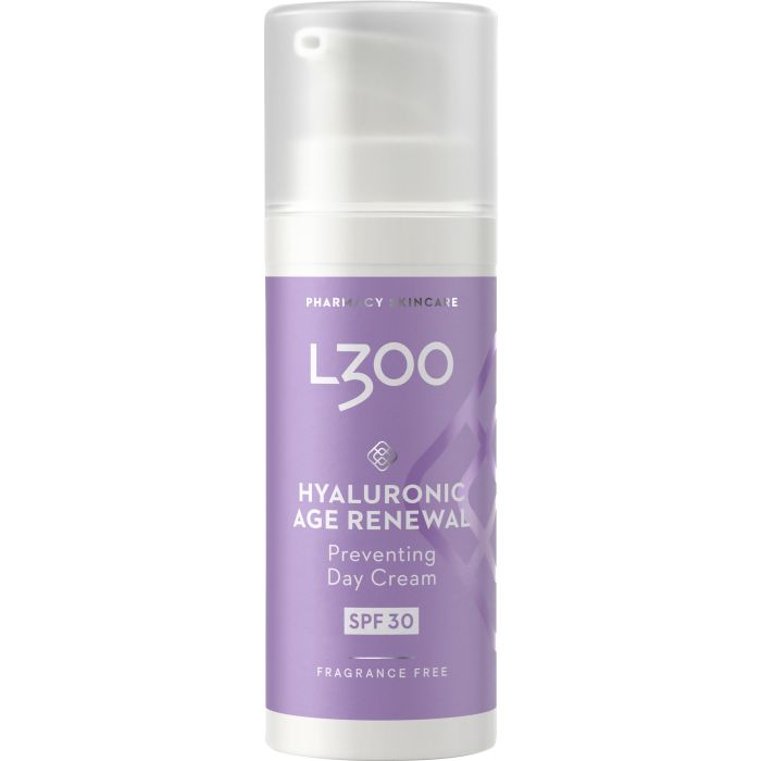 L300 Hyaluronic Age Renewal Day Cream SPF 30 on kasvovoide, joka antaa iholle kosteutta ja kiinteyttä, vahvistaa ihon suojakerrosta sekä vaikuttaa ennaltaehkäisevästi ikääntymisen merkkejä vastaan. SPF 30 suojaa ihoa UVA ja UVB-säteiltä ja auttaa estämään auringonvalon aiheuttamaa ihon ikääntymistä. Hajusteeton. Sopii normaalille ja kuivalle iholle. Dermatologisesti testattu herkällä iholla.