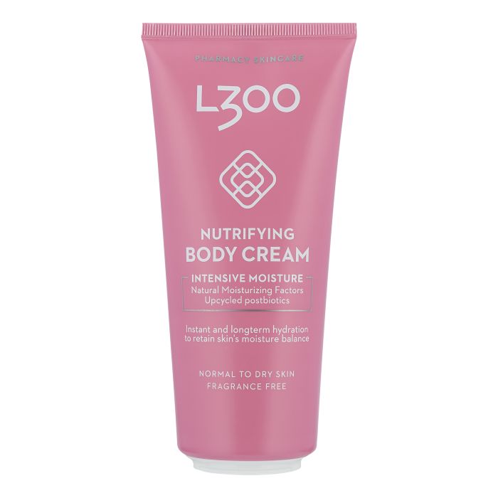 L300 Intensive Moisture Nutrifying Body Cream on täyteläinen vartalovoide, joka kosteuttaa ja ravitsee ihoa välittömästi ja pitkäkestoisesti. Sisältää kosteuttavia Natural Moisturizing Factors -tekijöitä, joita on luontaisesti iholla. Kiertotaloudesta saadut postbiootit vahvistavat ihon suojakerrosta ja tukevat tervettä ihoa. Tuloksena on ihanan pehmeä ja kosteutettu iho vahvalla suojakerroksella. Dermatologisesti testattu. Hajusteeton. Sopii normaalille ja kuivalle iholle.