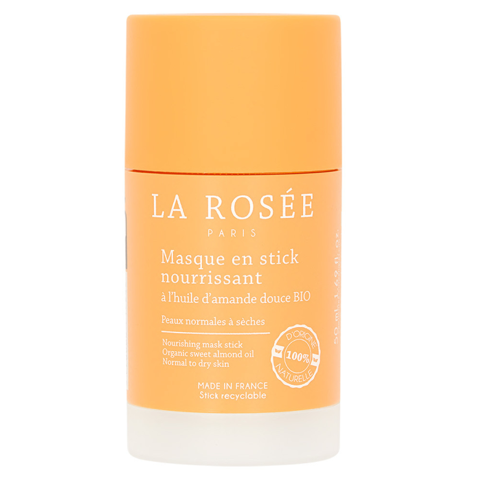 La Rosée, nourishing mask stick, naamiopuikko, normaalille, kuivalle ja erittäin kuivalle iholle, myös herkälle iholle. Käy myös sekaihon kuiville alueille. 100 % luonnollista alkuperää, kiinteä koostumus, ei sisällä vettä tai säilöntäaineita, 84 % biohajoava, kierrätettävä pakkaus.