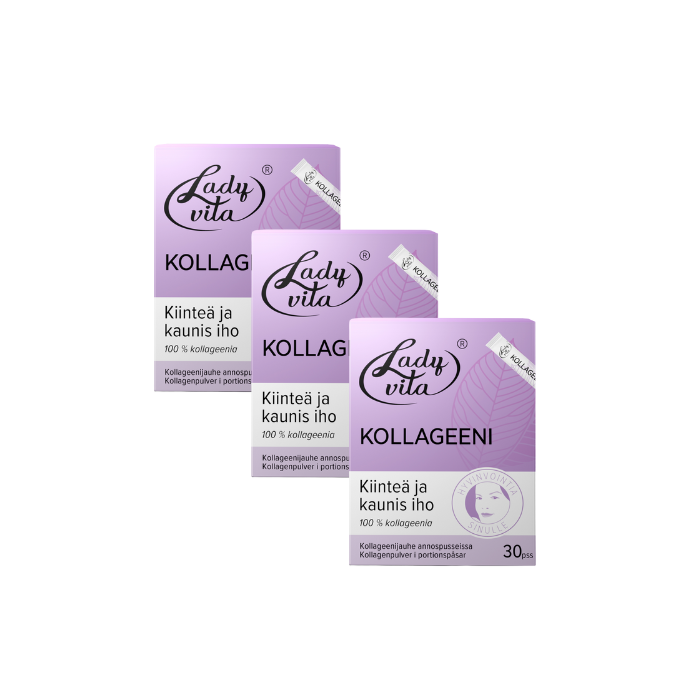 Ladyvita Kollageenijauhe on neutraalinmakuinen ja käyttövalmis annosjauhe, joka on helppo sekoittaa veteen, muuhun nesteeseen tai ruokaan. Sisältää 100 % VERISOL® -kollageenia. Kliiniset tutkimukset osoittavat, että VERISOL® auttaa vähentämään ryppyjä sekä parantamaan ihon joustavuutta 2500 mg:n päiväannoksella. Ladyvita Kollageenijauheen sisältämä kollageeni on hydrolysoitua eli pilkottua.