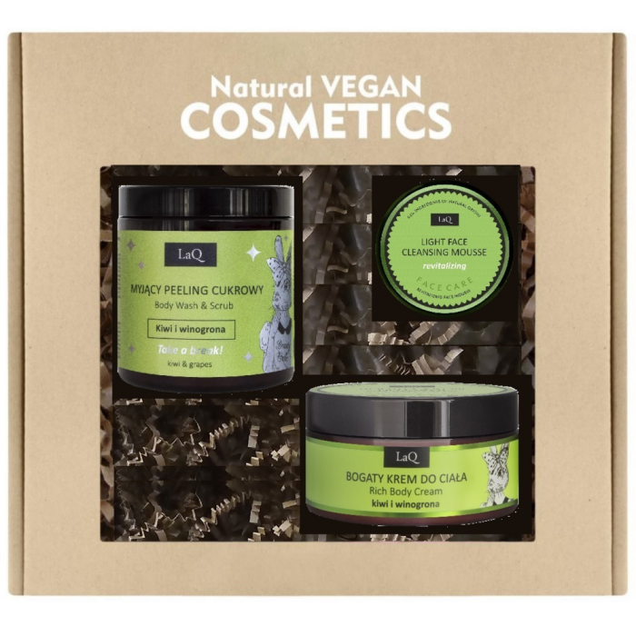 LaQ Kiwi and Grapes Pesu- ja kuorinta Wash and Scrub 220 g: Sucrose, Glycerin, Aqua, Sorbitol, Sodium Lauroyl Isethionate, Disodium Lauryl Sulfosuccinate, Sodium Chloride, Butyrospermum Parkii Butter, Vitis Vinifera Fruit Extract, Actinidia Chinensis Fruit Extract, Cinnamomum Zeylanicum Bark Extract, Green Coffee Bean Extract, Capsicum Annuum Fruit Extract, Zingiber Officinale Root Extract, Oryza Sativa Extract, Avena Sativa Kernel Extract, Linum Usitatissimum Seed Extract, Levulinic Acid, Potassium Sorbate, Sodium Benzoate, Parfum, Cl 42090, Cl 19140.