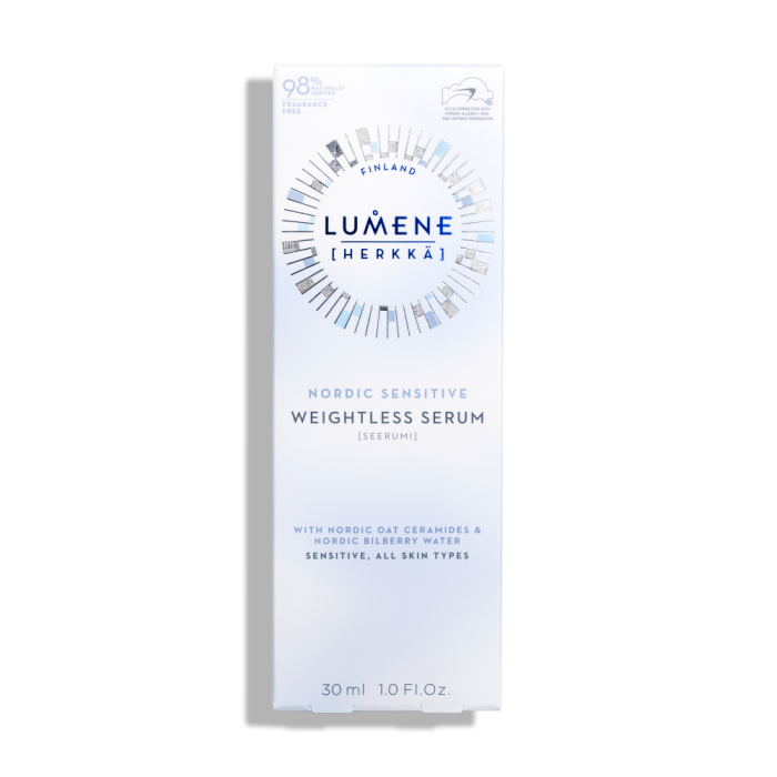 Kevyt, hajusteeton seerumi rauhoittaa herkkää ihoa välittömästi ja vahvistaa vahingoittunutta ihon suojakerrosta. Kliinisesti testattu herkällä iholla. LUMENE [Herkkä] Rauhoittava seerumi on keramideilla tehostettu geelimäinen seerumi kaikille herkille ihotyypeille. Hyödyntämällä ihon suojakerrosta tukevaa pohjoista kaurakeramidia ja kosteuttavaa mustikkavettä, tämä nopeasti imeytyvä koostumus vähentää ihon punoittavaa ja kuivaa ulkonäköä, rauhoittaa välittömästi ja vahvistaa ihon suojakerrosta. Tuotteella Allergia-, Iho- ja Astmaliiton allergiatunnus. KLIINISESTI TESTATTU: Vahvistaa ihon suojakerrosta* 96% mielestä tuote vähentää ihon punoitusta Hajusteeton ja vegaaninen seerumi sisältää elintarvike-ja metsäteollisuuden sivuvirroista kehitettyjä ja pohjoisen luonnosta peräisin olevia raaka-aineita. Pakkauksessa on käytetty kierrätettyjä ja kierrätettäviä materiaaleja. Valmistettu Suomessa. Yhteistyössä